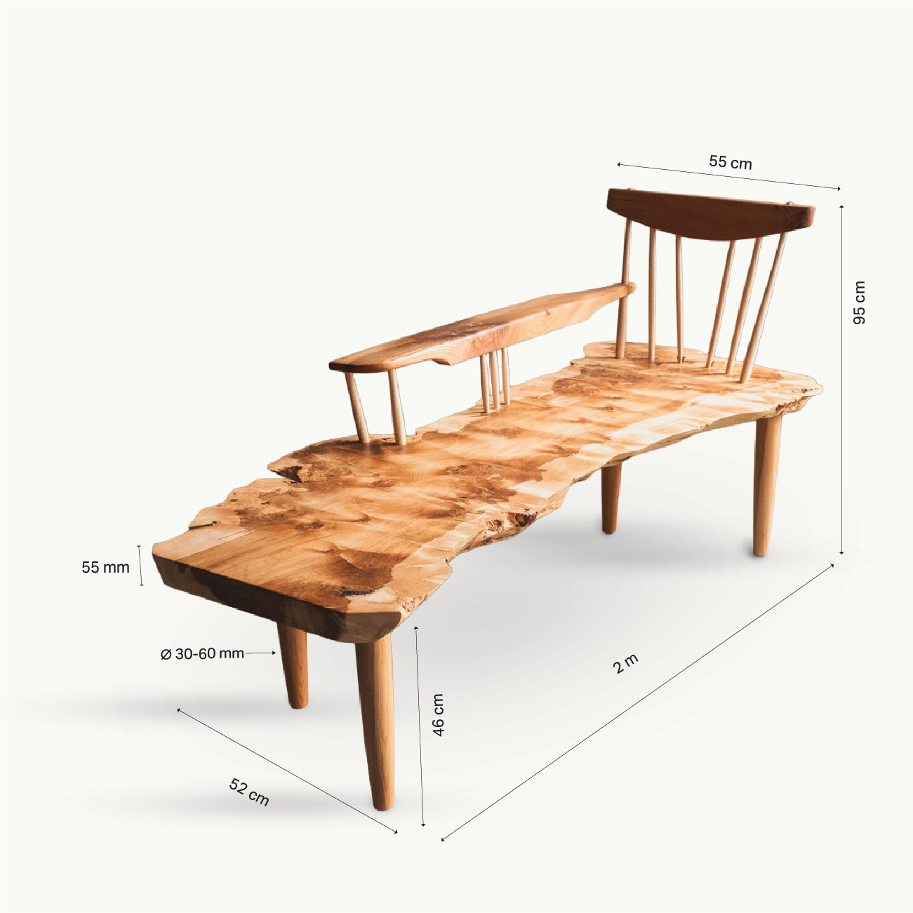 Ein einziges Stück Pappel, wild gemasert, 55 cm stark – ein Monument aus Holz. Die Bank „Nakaschima“ trägt die Schönheit der Unregelmäßigkeit in sich: der Naturrand, die feinen Linien, das Wechselspiel der Maserung. Ganz im Sinne von Wabi-Sabi zeigt sie, dass wahre Ästhetik im Unvollkommenen liegt. Kein zweites Stück Holz erzählt dieselbe Geschichte. „Nakaschima“ ist nicht nur eine Sitzbank, sondern ein seltener Moment der Natur, eingefangen in massiver Form.