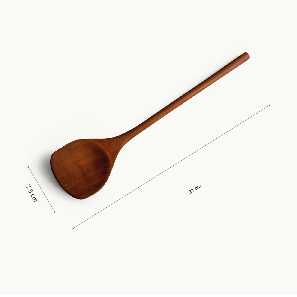 Dieser handgefertigte Kochlöffel aus Elsbeere ist ein unschätzbares Werkzeug in jeder Küche. Seine flache Form und abgerundeten Kanten machen ihn ideal als Pfannenwender oder zum Umrühren von Essen. Seine spezifische Form sorgt dafür, dass keine Kratzer oder sonstige Schäden auf empfindlichen Oberflächen entstehen, während die abgeflachte Fläche eine effiziente Nutzung bei sämtlichen Kochutensilien gewährleistet.