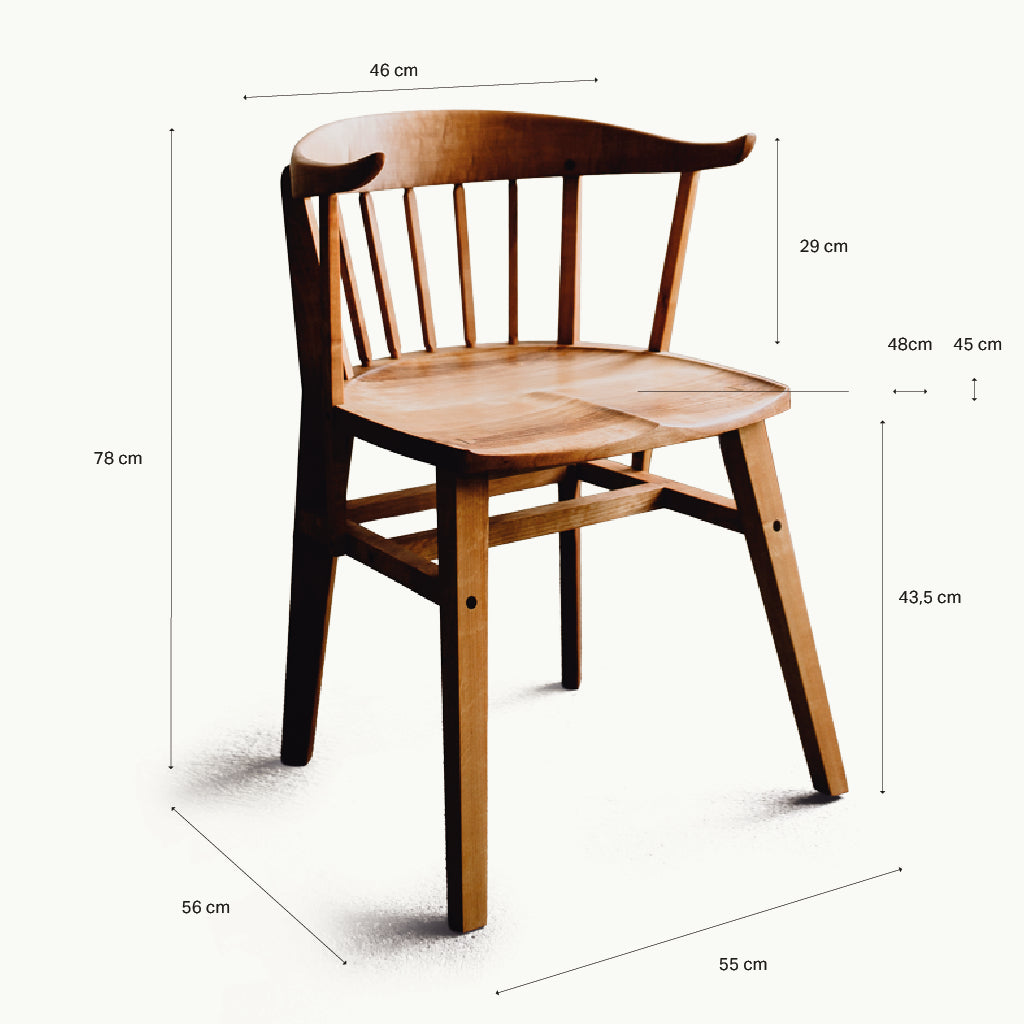 Der Armlehnenstuhl erinnert an klassische Windsor-Chairs, wird jedoch in Eiche, Erle oder Elsbeere neu interpretiert. Durch Dampf gebogen, bleibt das Holz elastisch und zugleich stark – Symbol für die Beständigkeit, die jedes Stück in sich trägt. Der Sitz ist geformt, nicht gefräst: jede Rundung folgt dem Handwerk, nicht der Maschine.